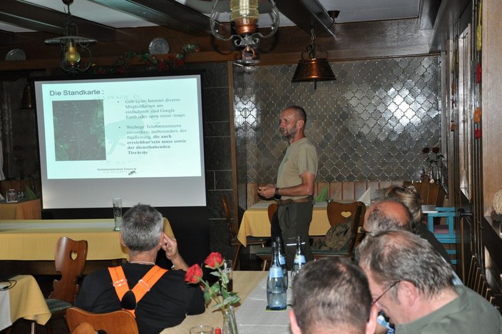 Auf Grundlage seiner umfassenden Erfahrungen konnte German Kälberer in seinen Ausführungen lebendig aufgezeigen, was in Planung, Vorbereitung, Durchführung und Nachbereitung von Drückjagden zu bedenken ist und worauf es besonders ankommt. Auch zu den besonderen Herausforderungen bei den bald wieder anstehenden Drückjagden im Mais wurde ausgeführt. Ganz im Sinne einer Weiterbildung konnte bestimmt jeder Teilnehmer etwas für sich mitnehmen und beim anschließenden geselligen Zusammensein vertiefen.