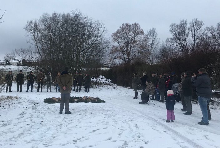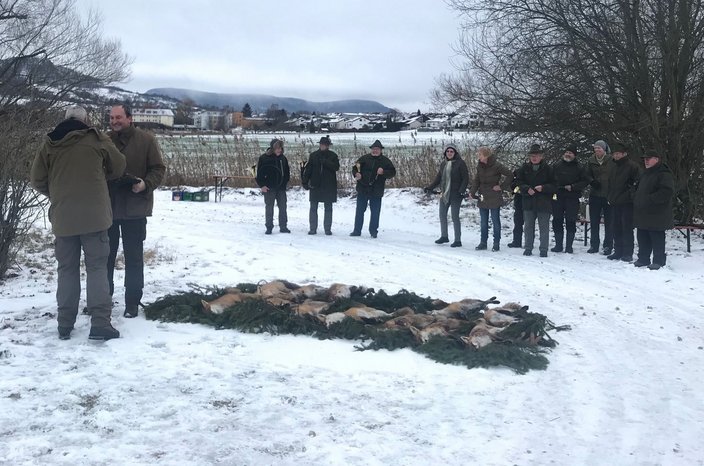 6 Jägern wurden ihre Erlegerbrüche überreicht, bevor im Anblick der Strecke mit insgesamt 12 Füchsen das Signal "Fuchs tot" durch unsere Bläsergruppe ertönte.