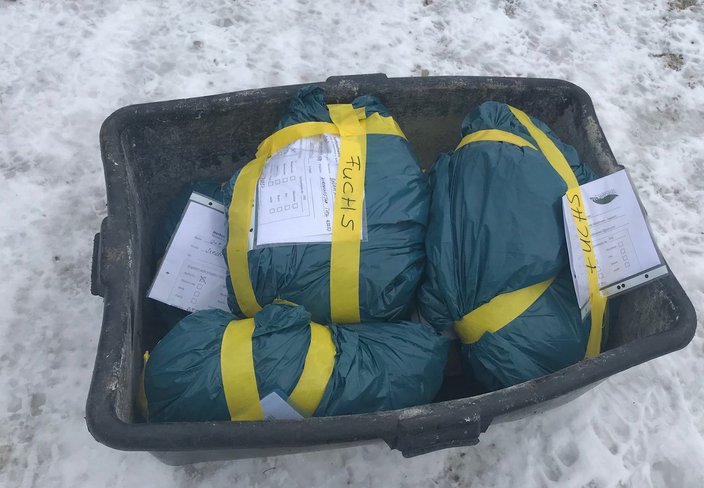 Von der Strecke waren 7 Füchse geeignet für die Verwertung der Bälge. Gemeinsam wurden die Kerne zur Abgabe an die Fellwechsel GmbH verpackt und direkt in die Kühltruhe unserer Sammelstelle gegeben. Der Balg des Fuchses verliert jetzt wieder jahreszeitbedingt seine Wertigkeit. Ab 01. Februar erlegte Füchse werden daher bis zur nächsten Saison von Fellwechsel GmbH nicht mehr angenommen. Mitglieder können als Schleppwild geeignete Füchse durchgängig der Jägervereinigung überlassen und in die Sammelgefriertruhe einbringen.