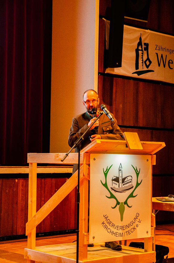 Kreisjägermeister German Kälberer thematisierte gleich zu Beginn den Ausbruch der Afrikanischen Schweinepest (ASP) in Deutschland. Er appellierte an den Zusammenhalt aller Jägerinnen und Jäger, ob im privaten Jagdrevier oder beim Forst aktiv, im Angesicht dieser schweren Aufgabe. „Wir werden alle daran gemessen werden, wie viele Schweine auf der Strecke liegen“, erinnerte er die Anwesenden an die bevorstehenden Verpflichtungen zur Eindämmung der ASP. Dabei thematisierte er auch die zu geringe Anzahl an verfügbaren ausgebildeten Stöberhunden und lobte den Einsatz und die Spenden für den Hundefond, der den Selbstbehalt für Mitglieder für Tierarztkosten nach Verletzungen der Hunde im jagdlichen Einsatz abgedeckt.