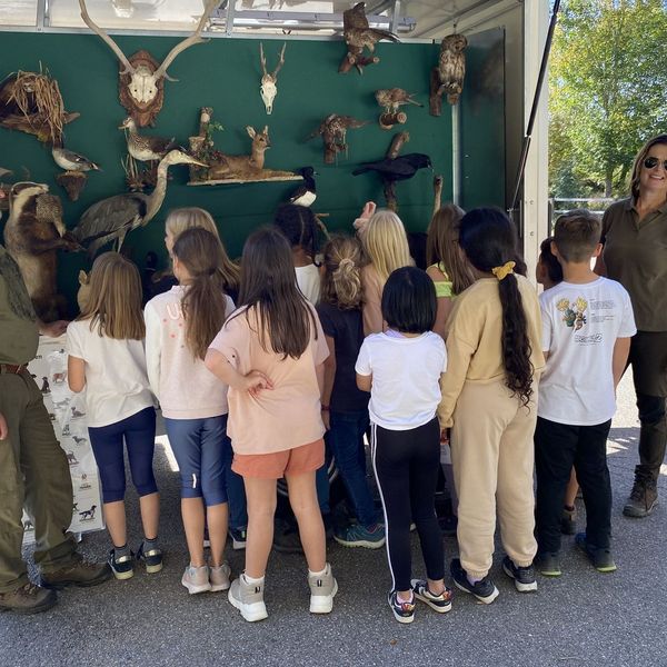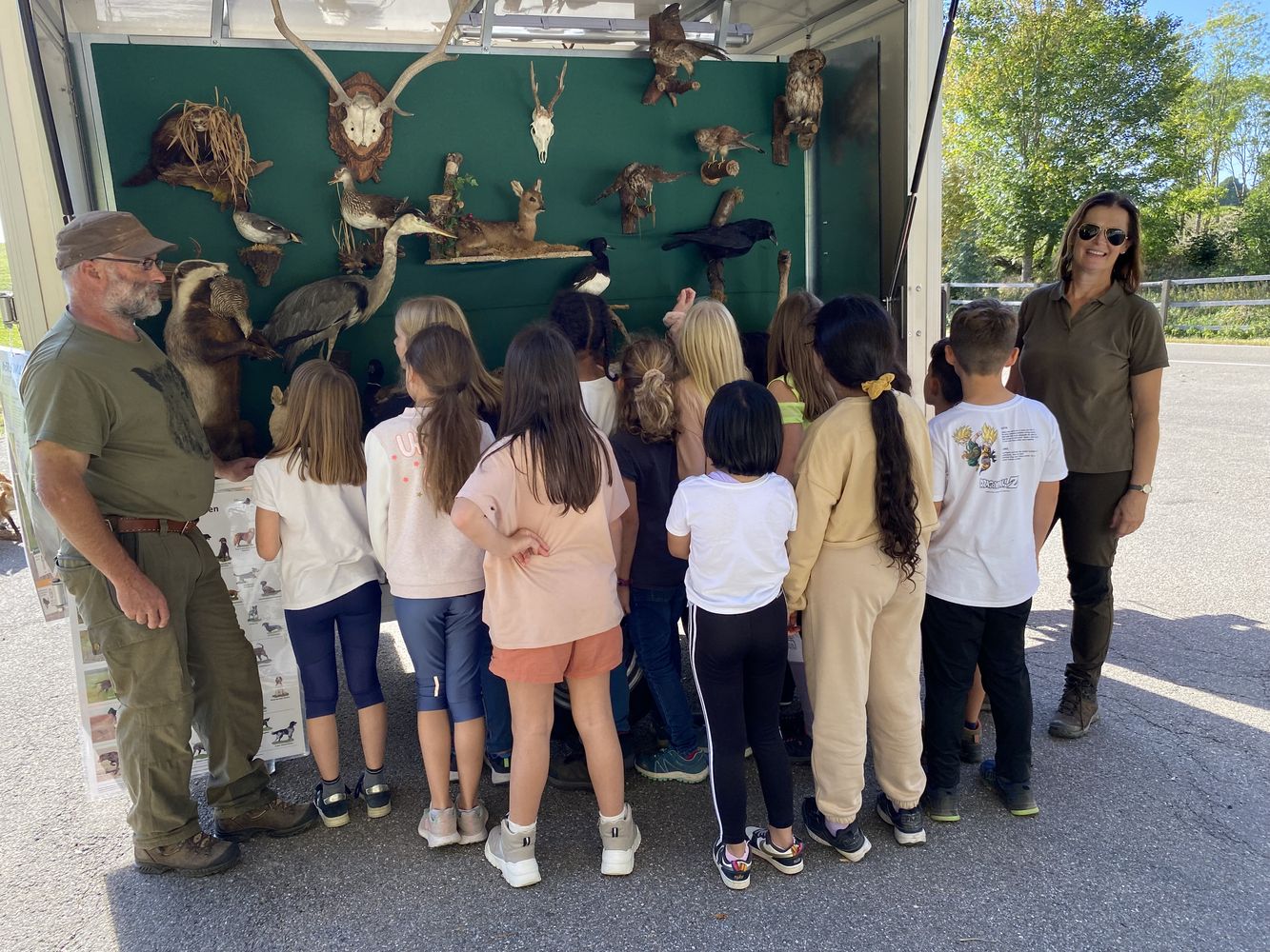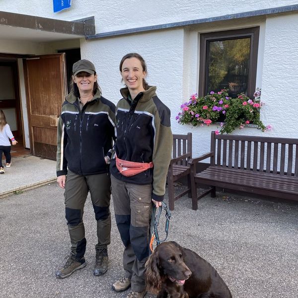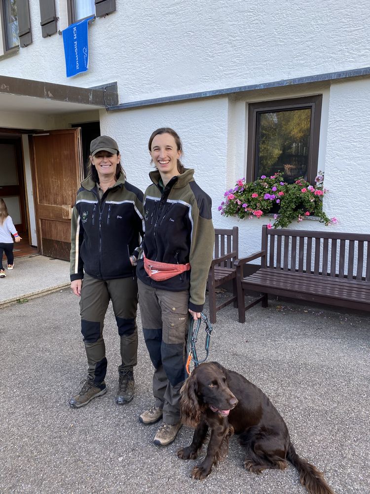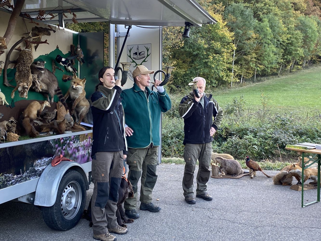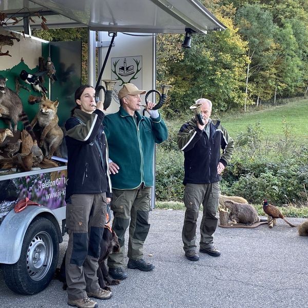 Gemeinsam mit Wachtelhund Rhemus holten Gabi Eichler und Isabell Stümpflen die erste Schülergruppen der insgesamt 60 Schülerinnen und Schülern ab. Vor Ort wurden die jungen Gäste von drei Jagdhornbläsern begrüßt. Bei herrlichem Herbstwetter präsentierte das Team bei der Diepoldsburg die vielfältigen Präparate.