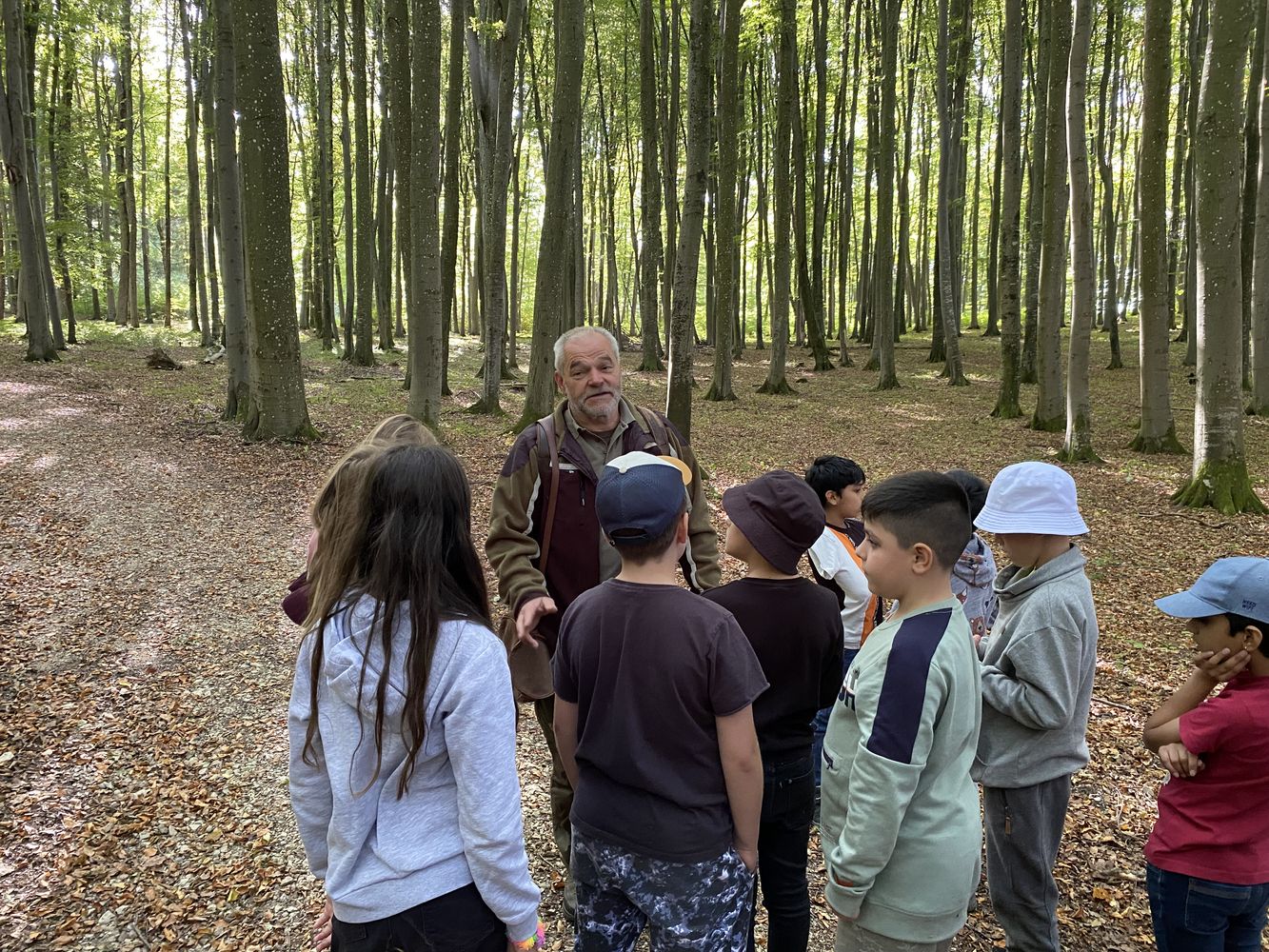 Ulrich Hoyler, Pächter des Ochsenwanger Reviers, führte uns in den Wald .Die Gruppe schaute unterschiedliche Baumarten, Hochsitze, Kirrungen und Wildschweinsuhlen an.