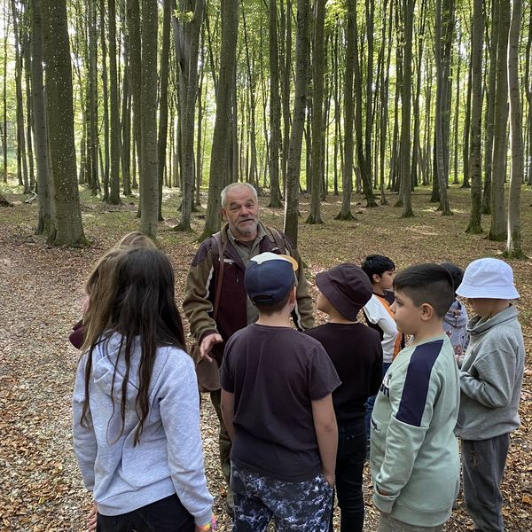 Um 10 Uhr 30 kamen die nächsten 20.Schüler, die wir auch mit Jagdmusik begrüßten und auch anschließend in den Wald und an unseren Hänger begleitet haben.