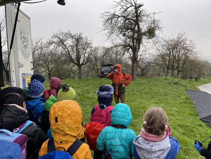 Herzlichst konnte Gabi Eichler vom Lernort-Natur-Team mit Jochen Sokolowski, Pächter des Dettinger Waldes, 20 Schüler und Schülerinnen mit ihren