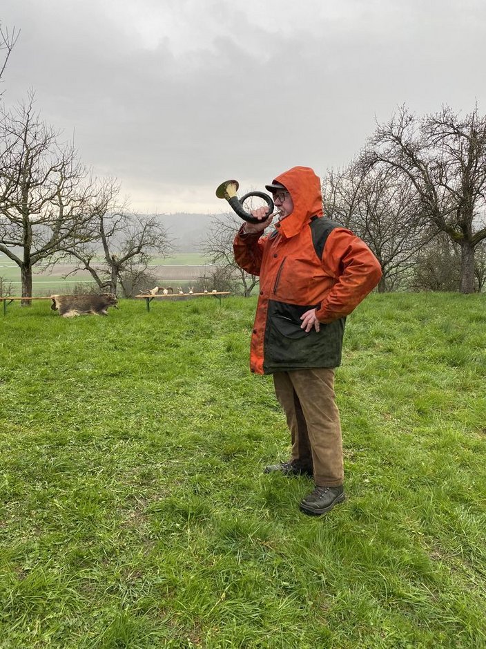 Jochen Sokolowski begrüßte die Schüler traditionell mit dem Jagdhorn und erklärte wie man darauf spielt,
