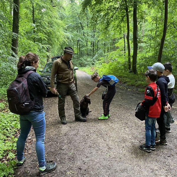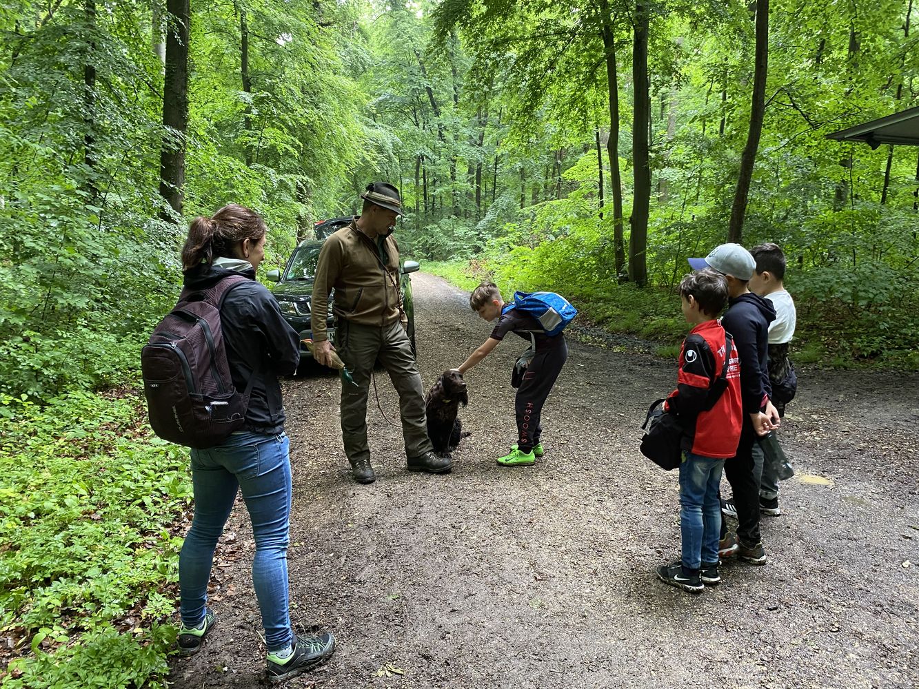 Das Team teilte anschließend die Klasse in kleine Gruppen auf und erklärte ihnen alle Wildtiere, die im Hänger ausgestellt oder im Wald versteckt waren.