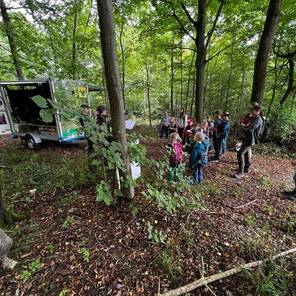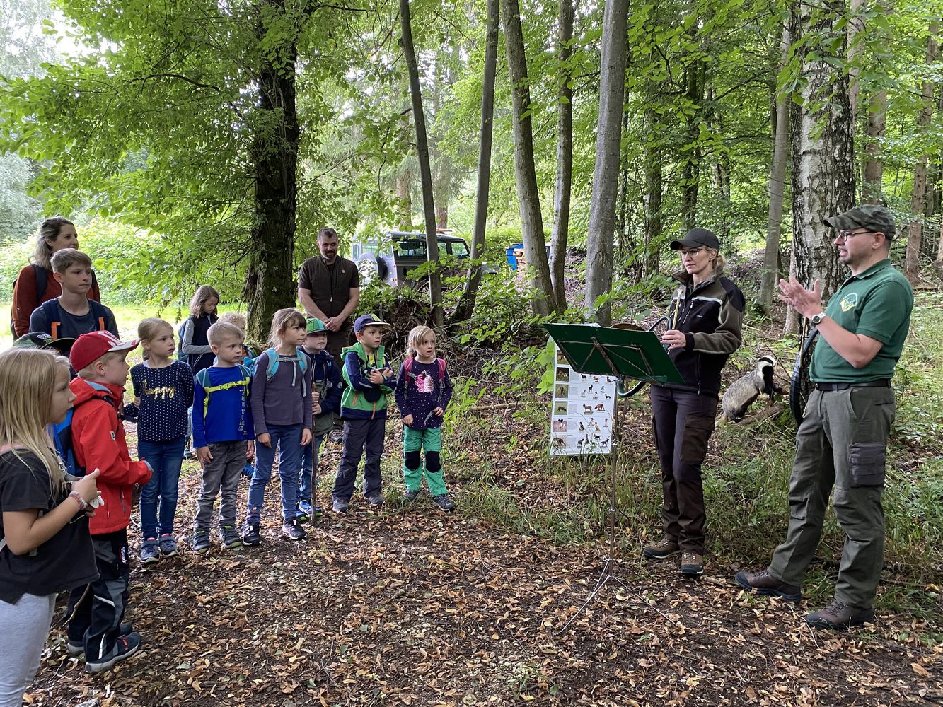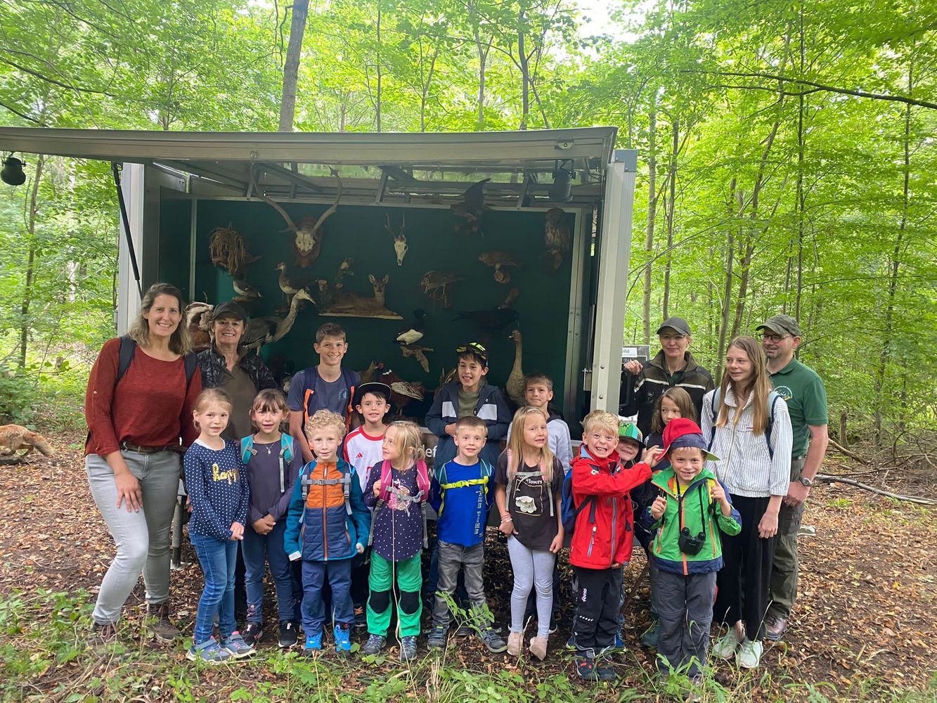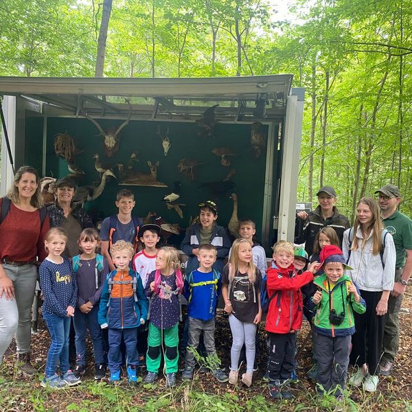 Anschließend wurden ihnen in kleinen Gruppen um den Lernort-Natur-Wagen die heimischen Wildtiere in Form von Präparaten gezeigt .