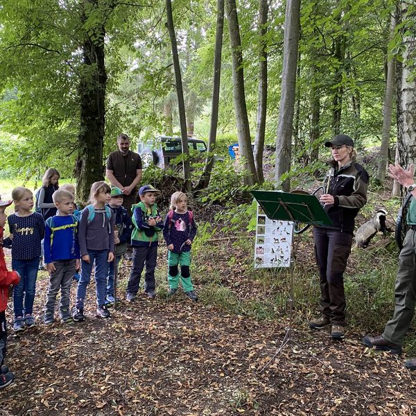 Herzlichst wurden die jungen Wanderer am Biel /Lindenspitz im Revier Ost in Bissingen mit jagdlichen Klängen durch Nicole Fischer und Andreas Bosch begrüßt.